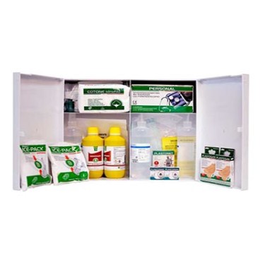 ARMADIETTO IN PLASTICA CPS521 Armadietto in robusta plastica antiurto, colore bianco, 2 ante, 3 ripiani interni. Dimensioni: cm 45 x 13 x 37,5 h. Contenuto: Elenco presidi Allegato 1 (aziende di gruppo A e aziende di gruppo B con 3 o più lavoratori): - 5 paia guanti sterili - 1 visiera paraschizzi - 3 flaconi di soluzione fisiologica da 500 ml - 2 flaconi di soluzione cutanea di iodopovidone al 10% iodio da 500 ml - 10 compresse di garza sterile 10 x 10 cm - 2 garze sterili 18 x 40 - 2 teli sterili per ustioni - 2 pinzette sterili monouso - 1 confezione di cotone idrofilo - 1 benda a rete elastica - 2 confezioni di cerotti di varie misure - 2 rotoli di cerotto h cm 2,5 - 1 paio di forbici - 3 lacci emostatici - 2 confezioni di ghiaccio istantaneo - 2 sacchetti monouso per rifiuti sanitari - 1 termometro - 1 apparecchio per la misurazione della pressione arteriosa - 1 foglio di istruzioni D.M. n. 388 - 1 foglio di istruzioni multilingua pronto soccorso